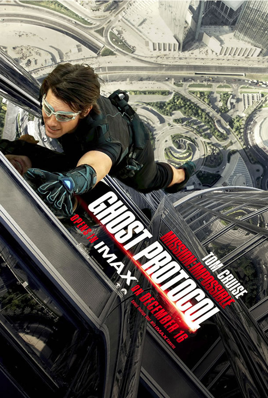 It’s been quite the few days for vertigo-inducing movie posters. First we had the very cool poster for Man on a Ledge, now Tom Cruise is doing his best ‘Man stuck to the side of the world’s tallest building’ impersonation in the new Mission: Impossible – Ghost Protocol poster.
